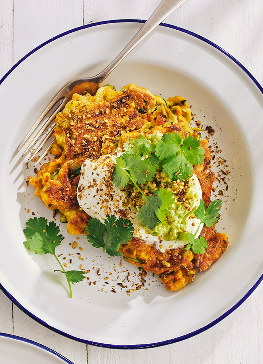 TO SERVE: Serve the fritters topped with a little yoghurt, avocado, coriander leaves and dukkah.