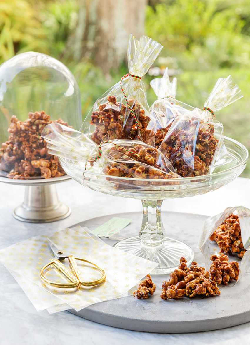 Place in the oven and cook for 50 minutes, turning the popcorn over halfway through cooking. Leave to cool completely on the tray then break into pieces and pack into cellophane bags. Tie tightly to seal. Makes about 9 cups