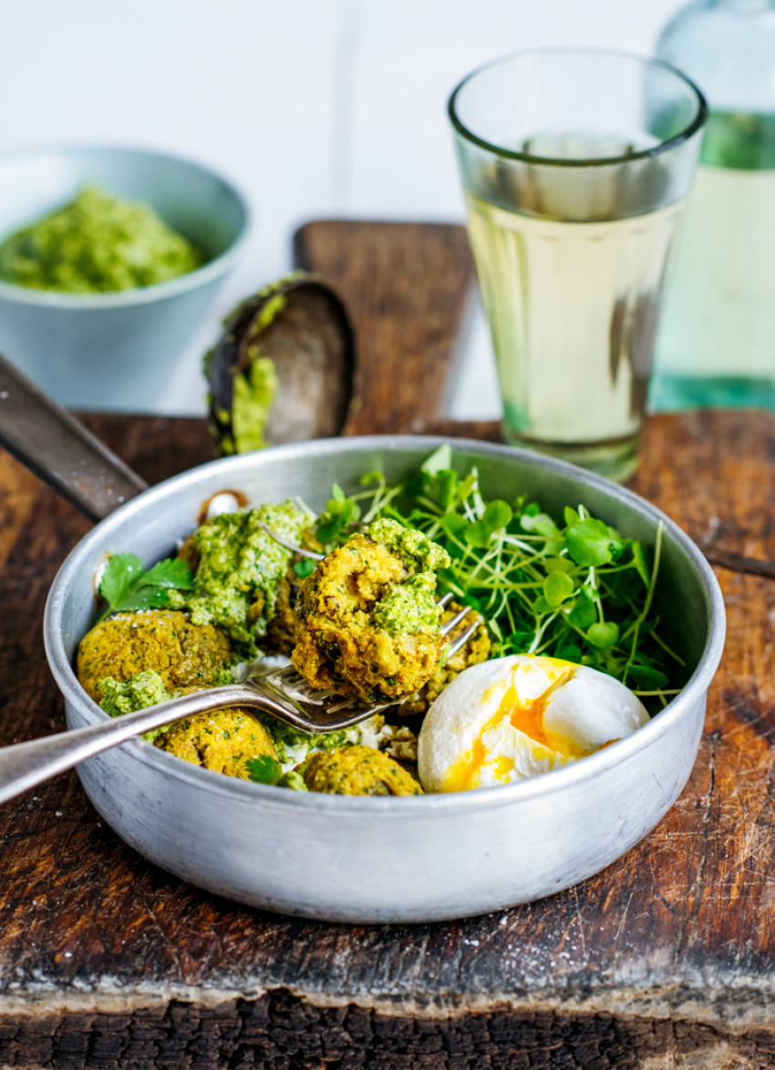 Serve the vege balls with salad greens tossed with oil and vinegar, poached eggs, a good dollop of pesto and a sprinkling of coriander.