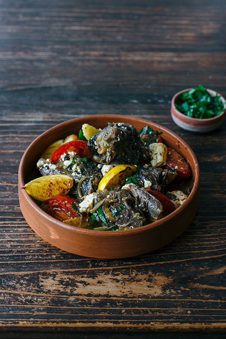 Add the potatoes, tomatoes and feta to the pan. Toss to coat in oil and juices and return to the oven for 40 minutes, or until the meat is falling off the bone. Serve in a shallow bowl with flat bread
