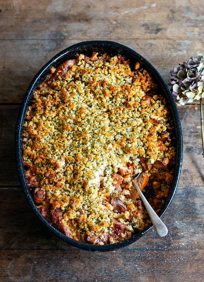 Put half the pork, bean and duck mix in a large ovenproof casserole dish. Slice the sausages into four pieces and stud through the mixture. Top with remaining pork mix and cover with breadcrumbs. Bake for 1 hour before serving with green vegetables.