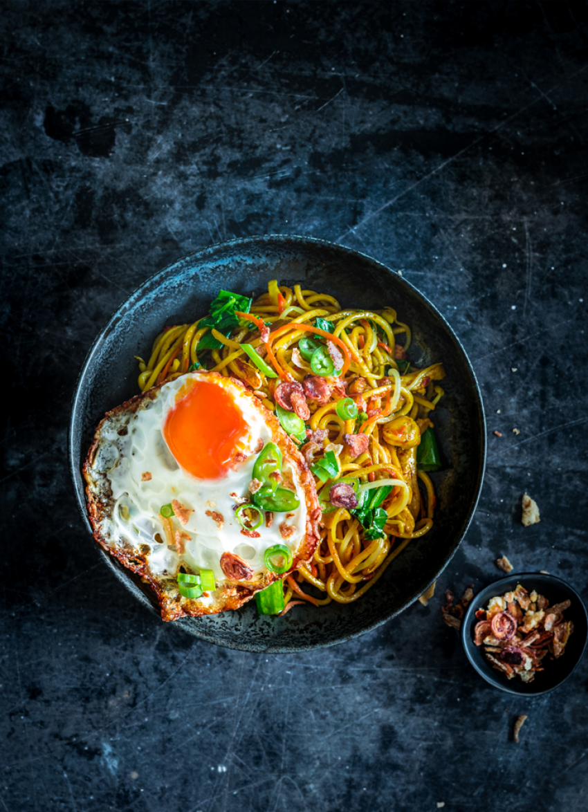 To serve: Serve the noodles in bowls topped with a fried egg, spring onion, fried shallots and chilli or sambal.