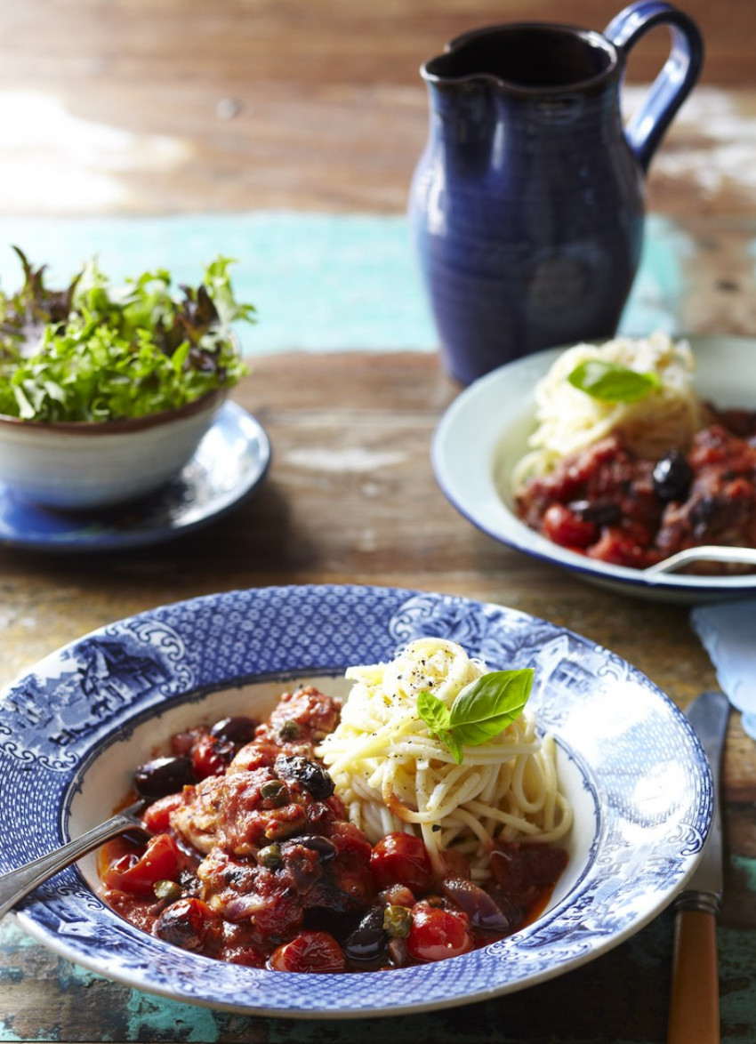 Heat the oil in a large sauté pan. Cut each chicken thigh into 2-3 pieces and season. Brown the chicken on both sides then transfer to an oven-proof baking dish. Add the onion, garlic, chilli flakes, anchovies and the oregano to the pan and cook until the onion is soft. Add the capers, olives and tomatoes and bring to the boil. Cook for 2 minutes then taste the sauce and season lightly if needed. The anchovies can be salty.