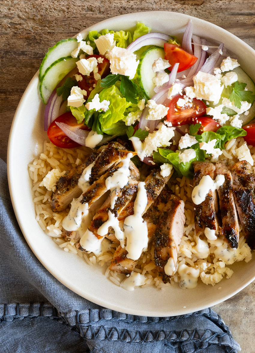 TO SERVE: Divide the rice among 4 bowls. Thinly slice the chicken crossways and arrange on top of the rice along with salad and whipped feta and yoghurt sauce. Crumble over some extra Mainland Feta Cheese. Serve any extra salad and sauce on the side.