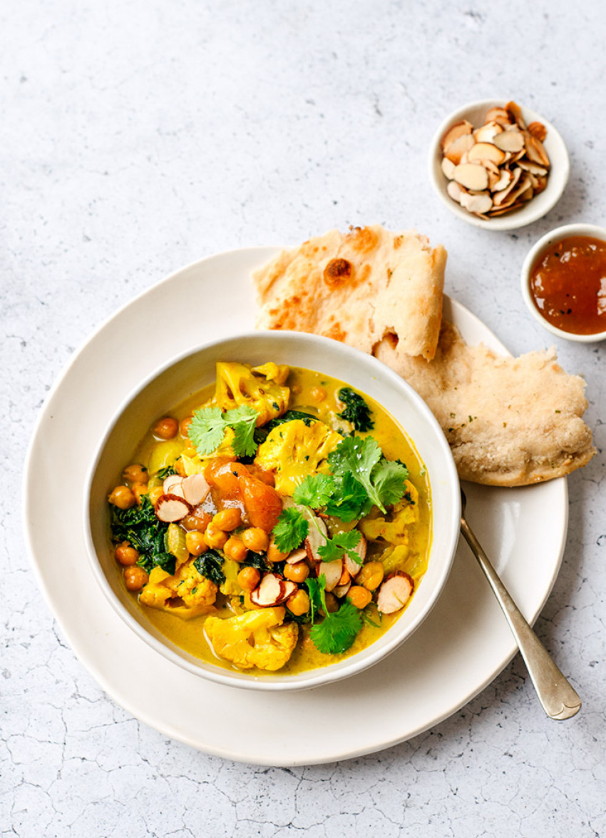 Heat the oil in a large, deep frying pan and cook the cumin seeds for a few minutes, until fragrant. Add the onion and cook for 6-7 minutes until the onion has softened. Add the ginger, garlic and spices, cook for 2 minutes, stirring, then add the cauliflower. Cook for 5 minutes, then add the coconut milk and frozen spinach. Cook a further 5 minutes or until the cauliflower is tender. Add the chickpeas and cook a few minutes to heat through. Serve with almonds, a good blob of chutney and some warm flat breads.