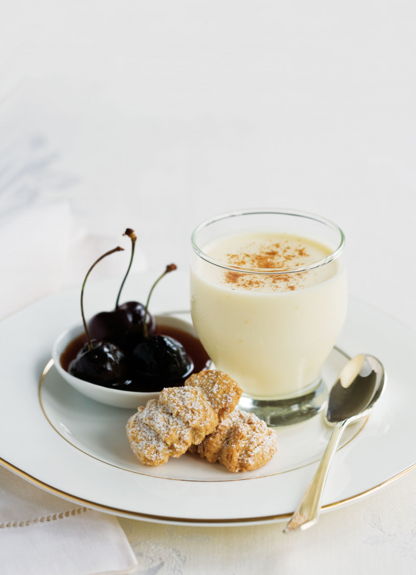 Chilled Cinnamon Creams with Cherries in Caramel Brandy Syrup