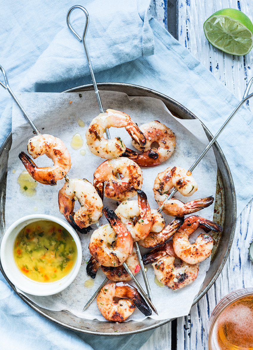 Thread 3–4 prawns on to metal or bamboo skewers (soak bamboo skewers in water for several hours to avoid burning).