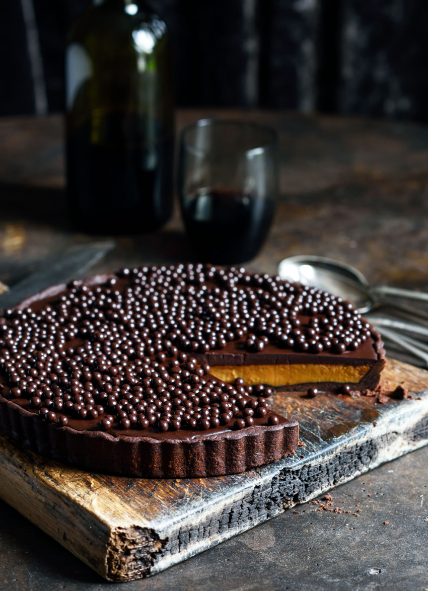 Sit for 10 minutes then pour chocolate filling over caramel and leave to set – this will take at least 3 hours, but you can easily make it until this point the day (or even 2 days) before. Don’t store it in the fridge unless it’s really hot, but if you do, remove it from the fridge half an hour before serving.