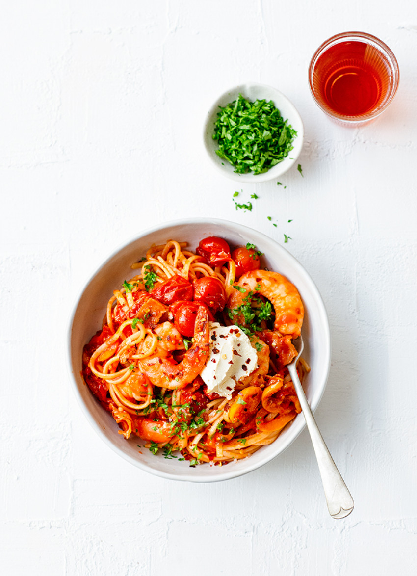 Add the drained pasta and cooking water to the prawn mixture and stir to combine. Divide among 4 serving bowls and top each with a scoop of mascarpone and a sprinkling of chilli flakes and parsley.