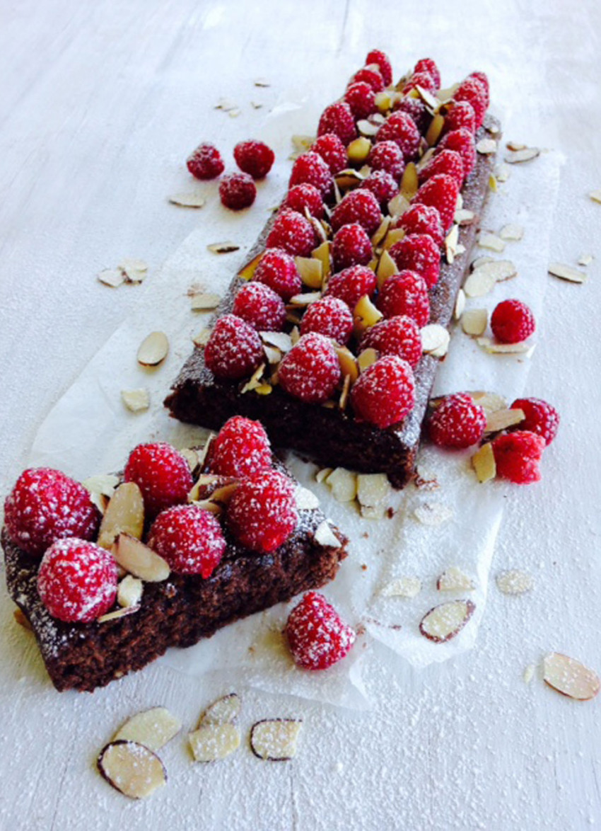 Arrange the raspberries over the top, then scatter with the almonds and dust with icing sugar. Serve with softly whipped cream or mascarpone.