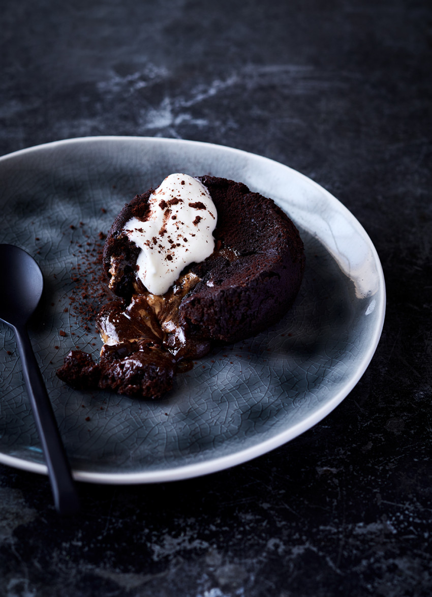 To serve: Gently run a knife around the inside of the ramekins. Place a small plate over the top of each pudding and invert both together. Using a tea towel, carefully lift off the ramekin and serve immediately with a dollop of cream and a pinch of cocoa.