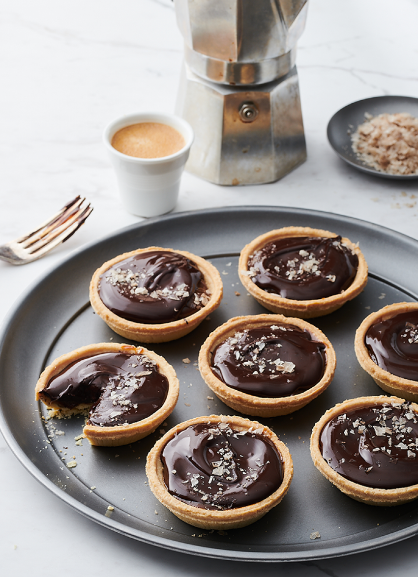 Spoon over the chocolate and spread with the back of a teaspoon then top with a pinch of salt. Serve immediately or chill for 30 minutes to set the chocolate. Makes 8 tarts