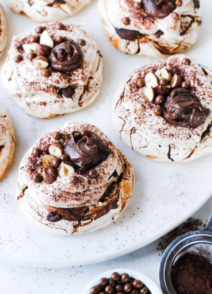 In this tempting recipe by Olivia Galletly, dark chocolate, hazelnuts and Nutella are folded through soft pillowy meringue and baked. They're then covered in chocolate cream, Nutella, hazelnuts, chocolate caramel pearls and dusted in cocoa.
