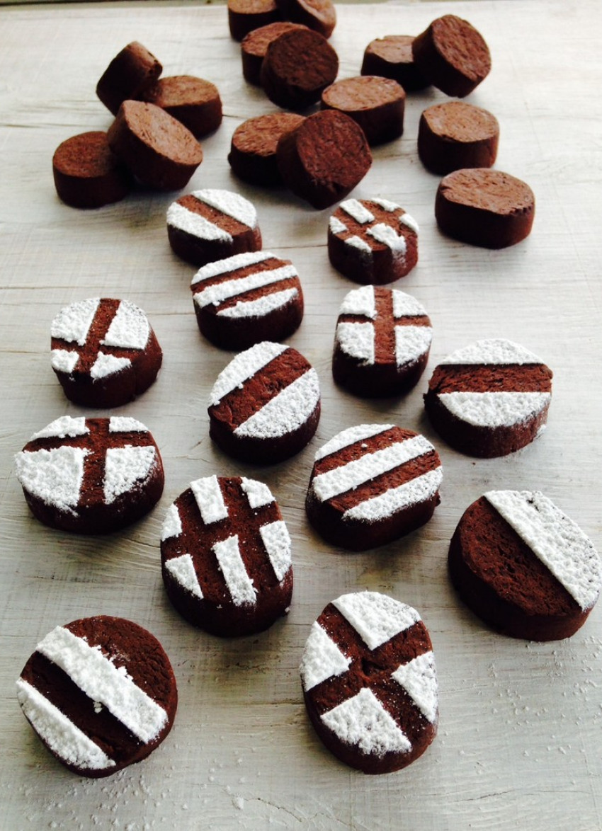 To decorate as per the photo, simply cut narrow strips of cardboard and place over the cookies in whatever pattern you want. Dust heavily with icing sugar then remove the strips, lifting them straight up so the icing sugar doesn’t fall back down onto the cookies.