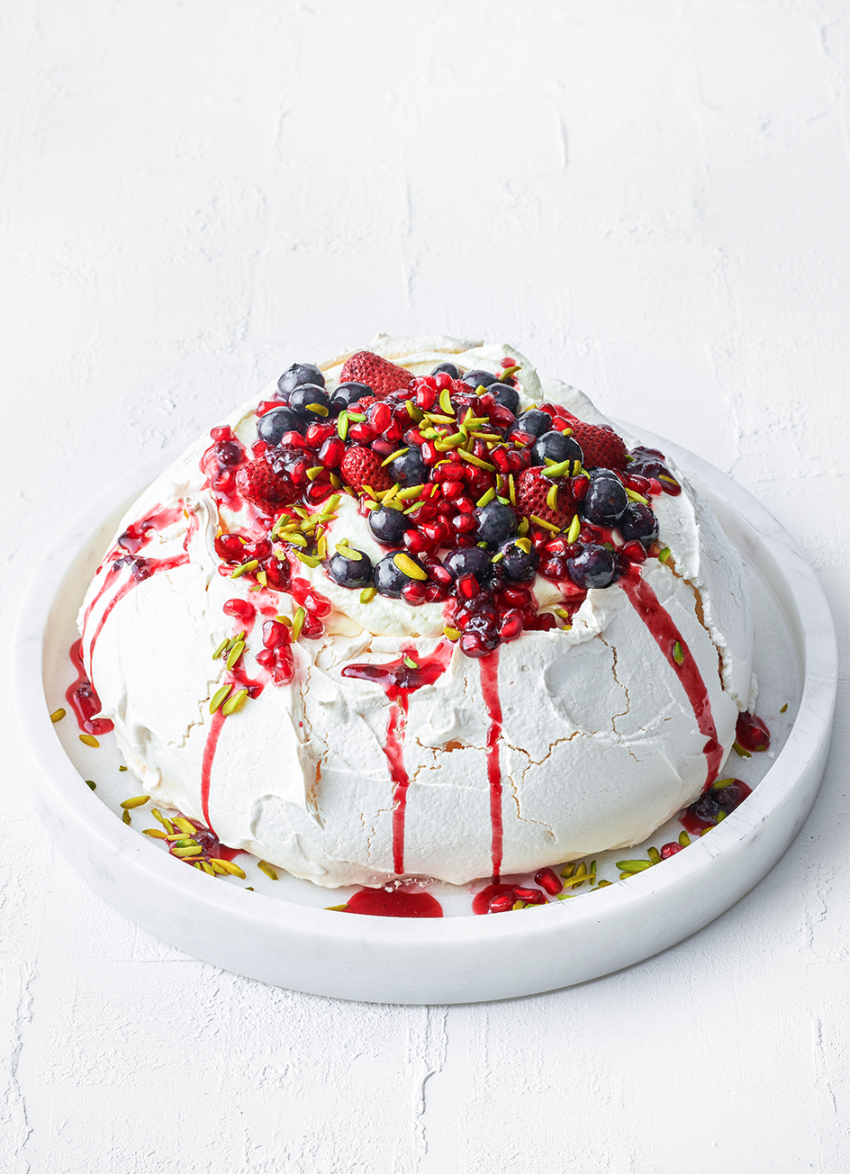 To assemble: Put the jam and 1 tablespoon of water in a bowl and microwave until bubbling. Add the blueberries and blackberries and stir to coat well so they are glossy. Cool. Gently dollop the cream over the pavlova and spoon on the berries, roasted strawberries, pomegranate arils and pistachios. Serve any remaining topping separately.