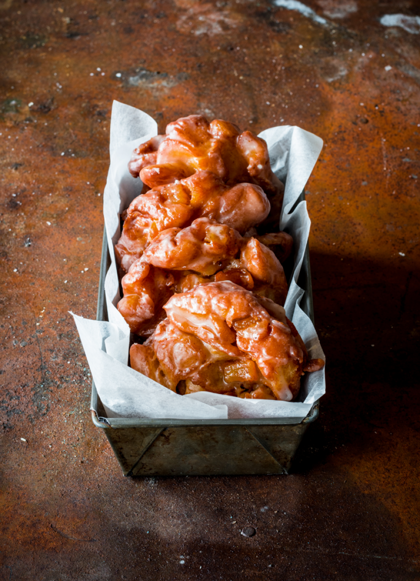 Deep-fried brioche dough is dotted with chunks of caramelised apples and dipped in a maple and cinnamon glaze – delicious!