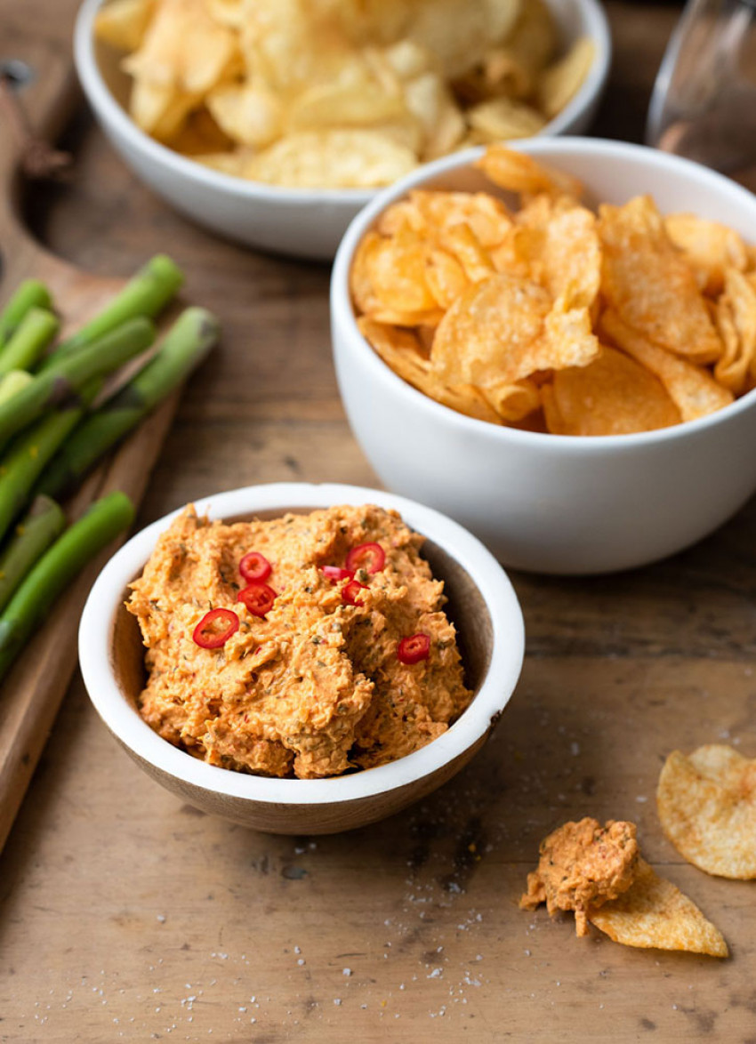 Brace yourself this is literally a two-minute recipe. It consists of bunging a jar of good quality chilli kimchi in a blender with cream cheese. It's perfect with the chilli, roast garlic & lemon oil Red Rock Deluxe Crisps.