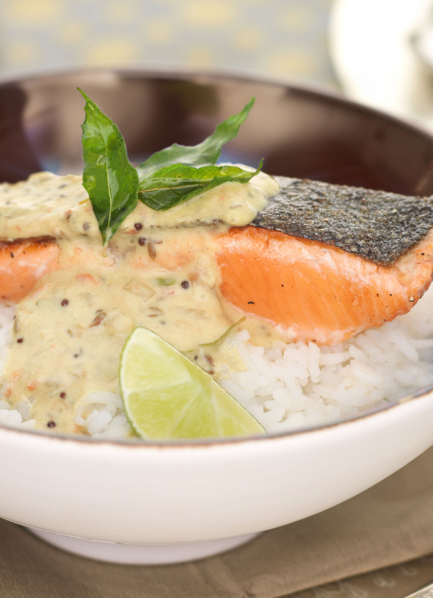 To serve: Place the rice in individual serving dishes and top with a fillet of fish. Spoon over the sauce and garnish with a lime wedge and crisp fried curry leaves.