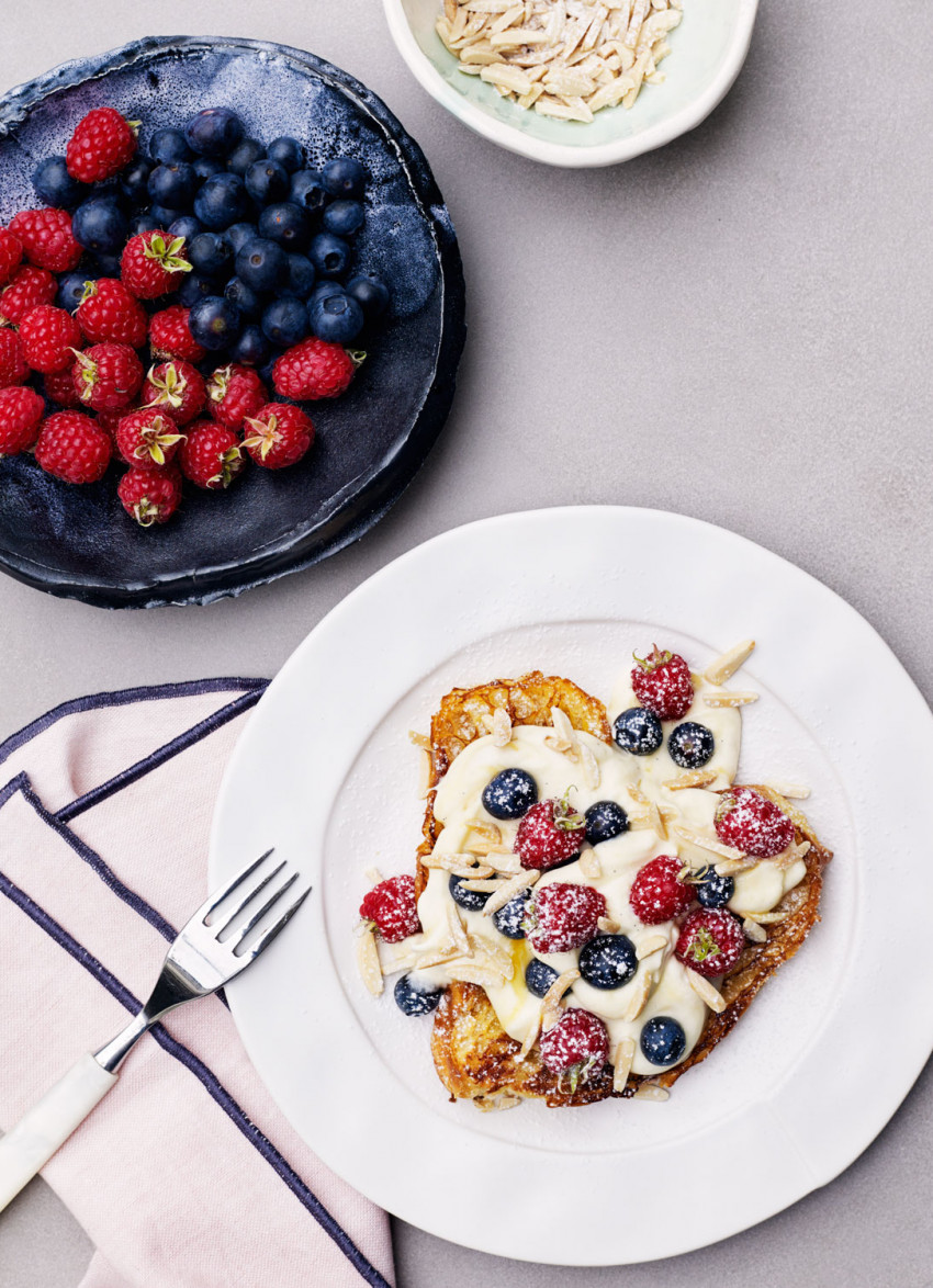 To serve: Place 2 pieces of cooled croissant on each plate and top with the lemon cream, berries and almonds. Dust with icing sugar.