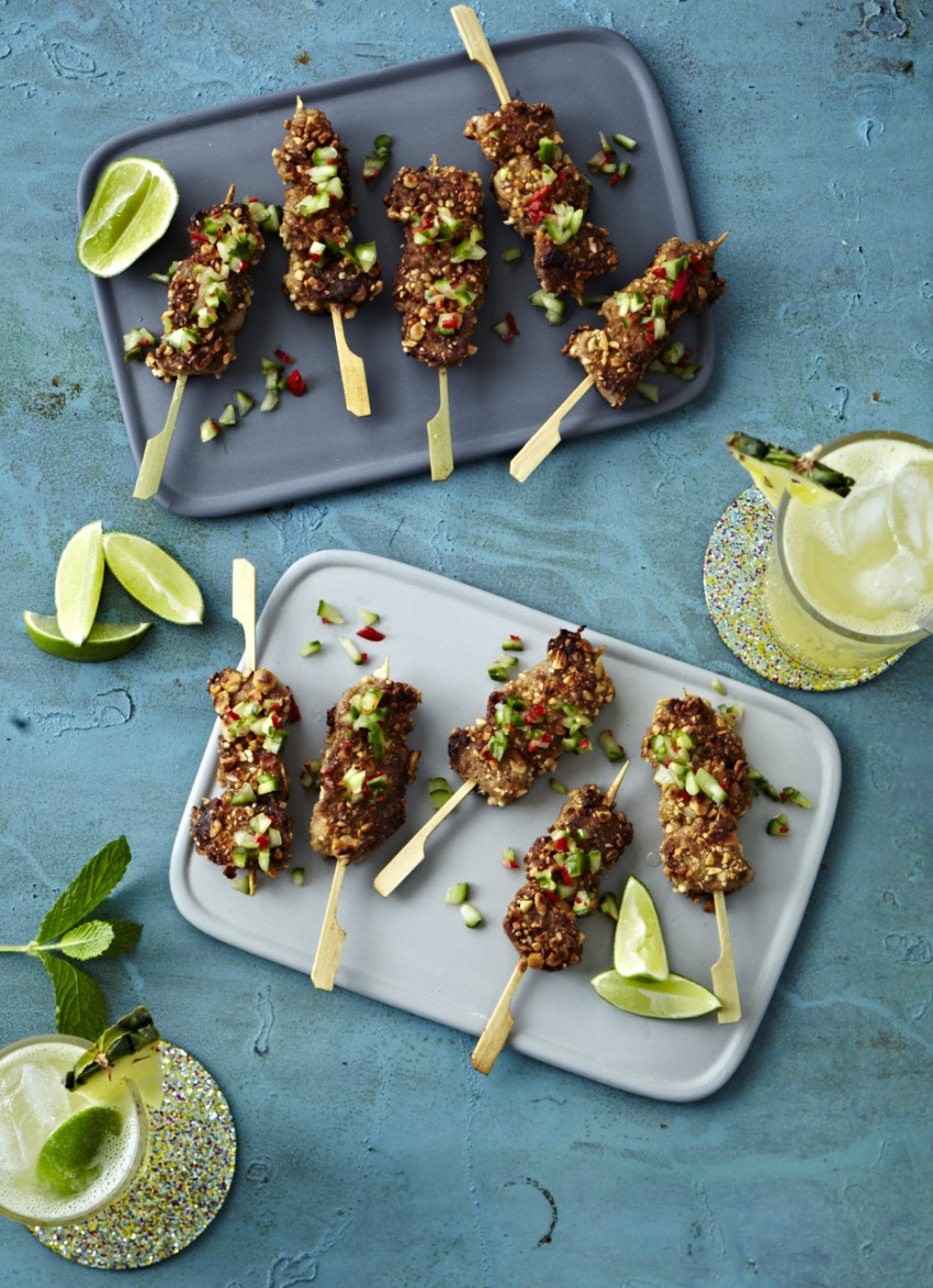 Place the peanut flour in a shallow dish and coat the kebabs, gently pressing it to adhere.