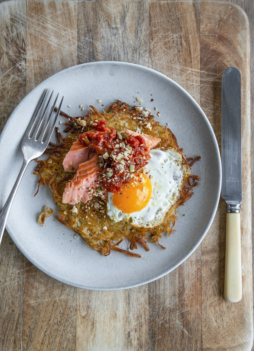 My perfect start or end to a day is a golden, crispy potato rösti topped with hot-smoked salmon, hot chilli relish and a soft-yolked fried egg.