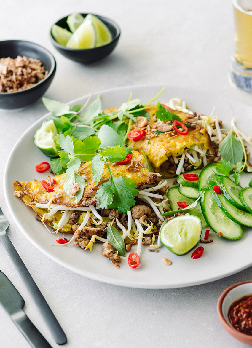 You can add fried tofu, fish or chicken to these tender crêpes. Be generous with the fresh herbs and limes for squeezing over.