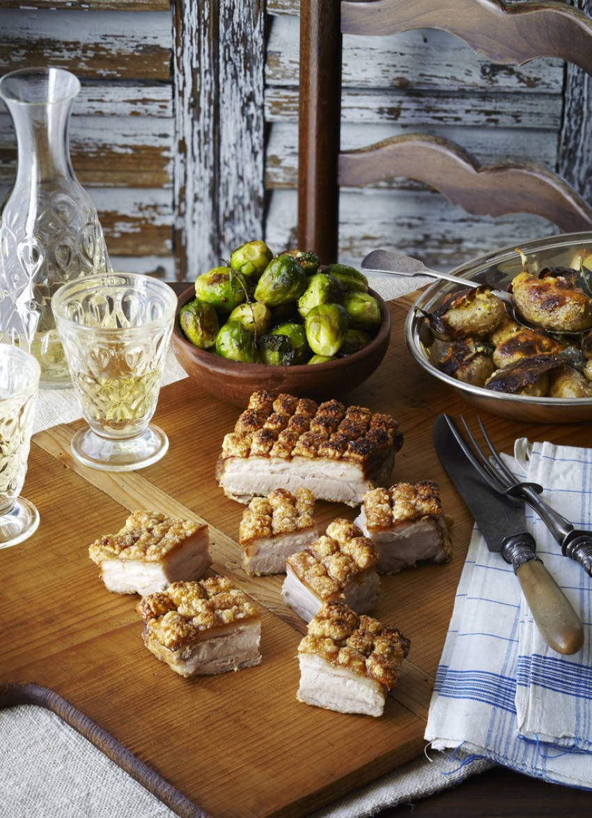 This combination of roasting and then braising the pork results in meltingly tender meat with gorgeous crispy crackling – heaven on a plate! The milk-braised potatoes are tender little morsels infused with the herbaceous aromatics.