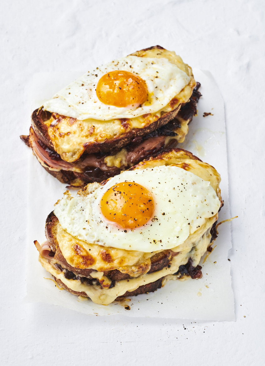 to assemble: Butter one side of each piece of bread. Lay 2 pieces buttered side down on a piece of baking paper. Spread each piece with 3 tablespoons of béchamel sauce and top with 3 pieces of ham. Top with the onion (if using) and remaining bread, buttered side up. Spread with 3 more tablespoons of béchamel each. Sprinkle with gruyère and pop in the oven until golden and bubbling, about 15 minutes. Top each sandwich with a fried egg.