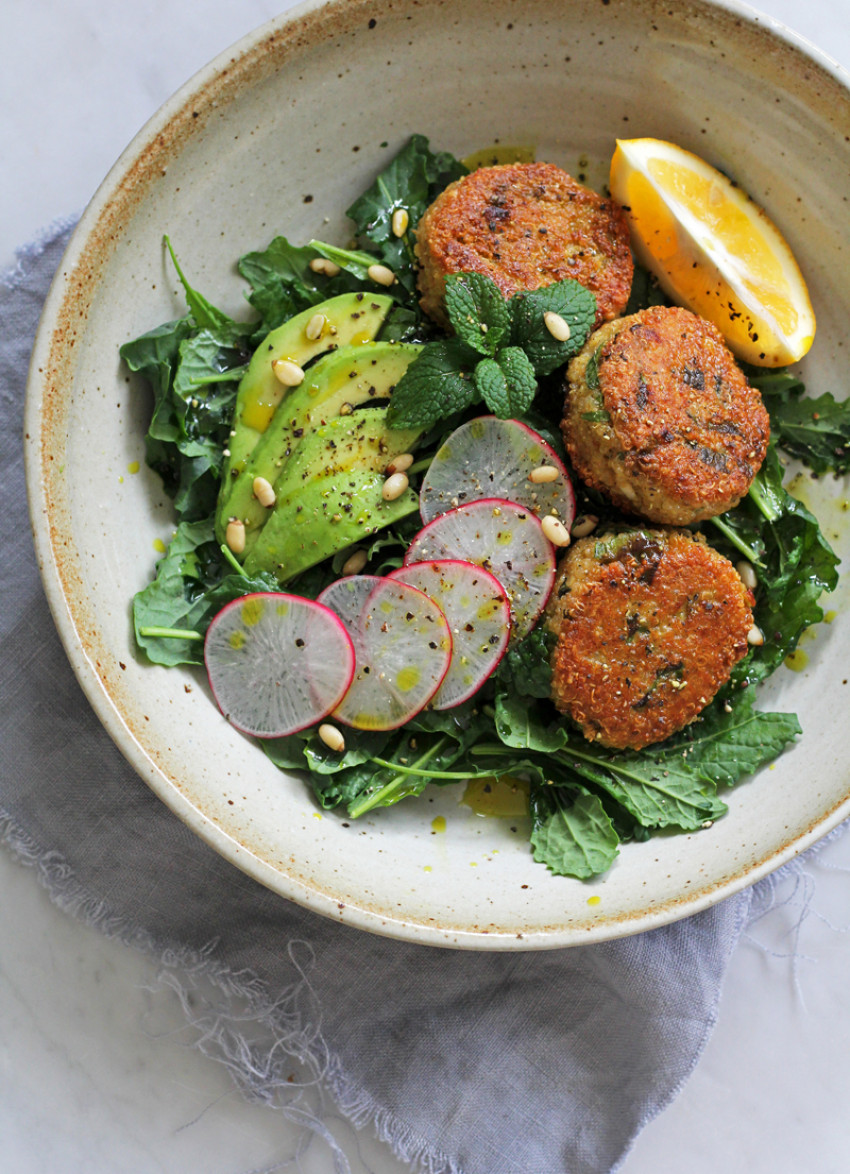 Divide the greens between four plates. Garnish each with the avocado and radish. Top with quinoa patties and serve immediately with a lemon wedge on the side.