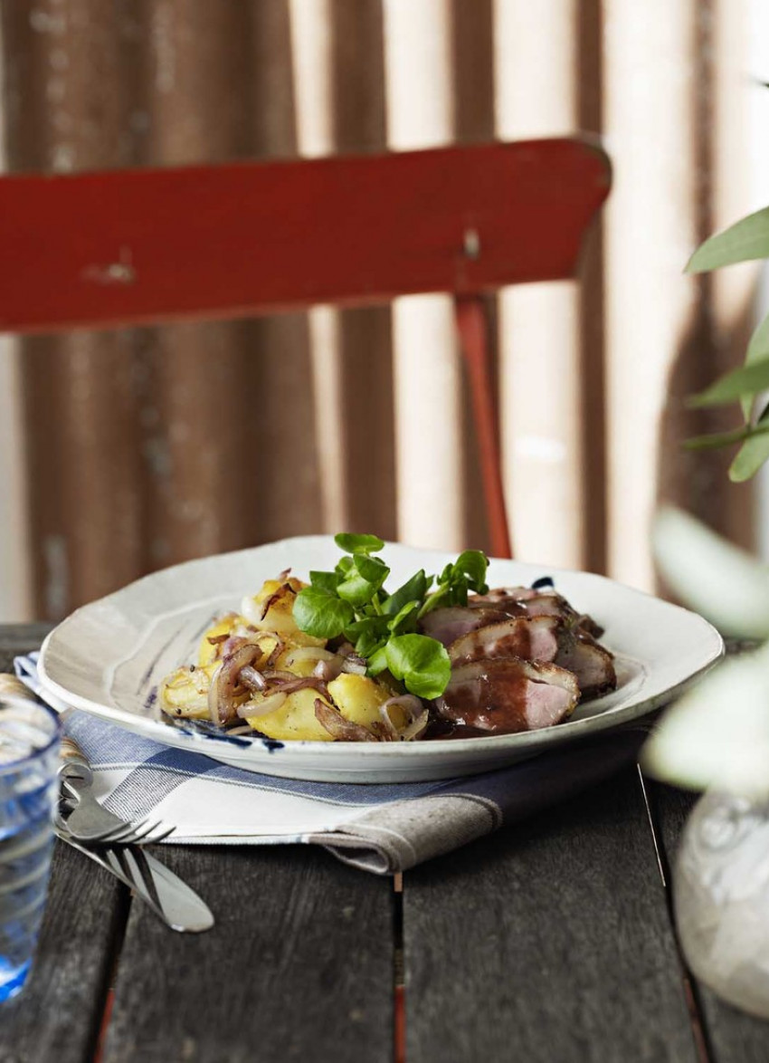 To serve: Slice the duck thinly on the diagonal. Arrange on plates with the sautéed potatoes. Spoon the sauce over the duck and serve immediately. Garnish with watercress or rocket if desired.