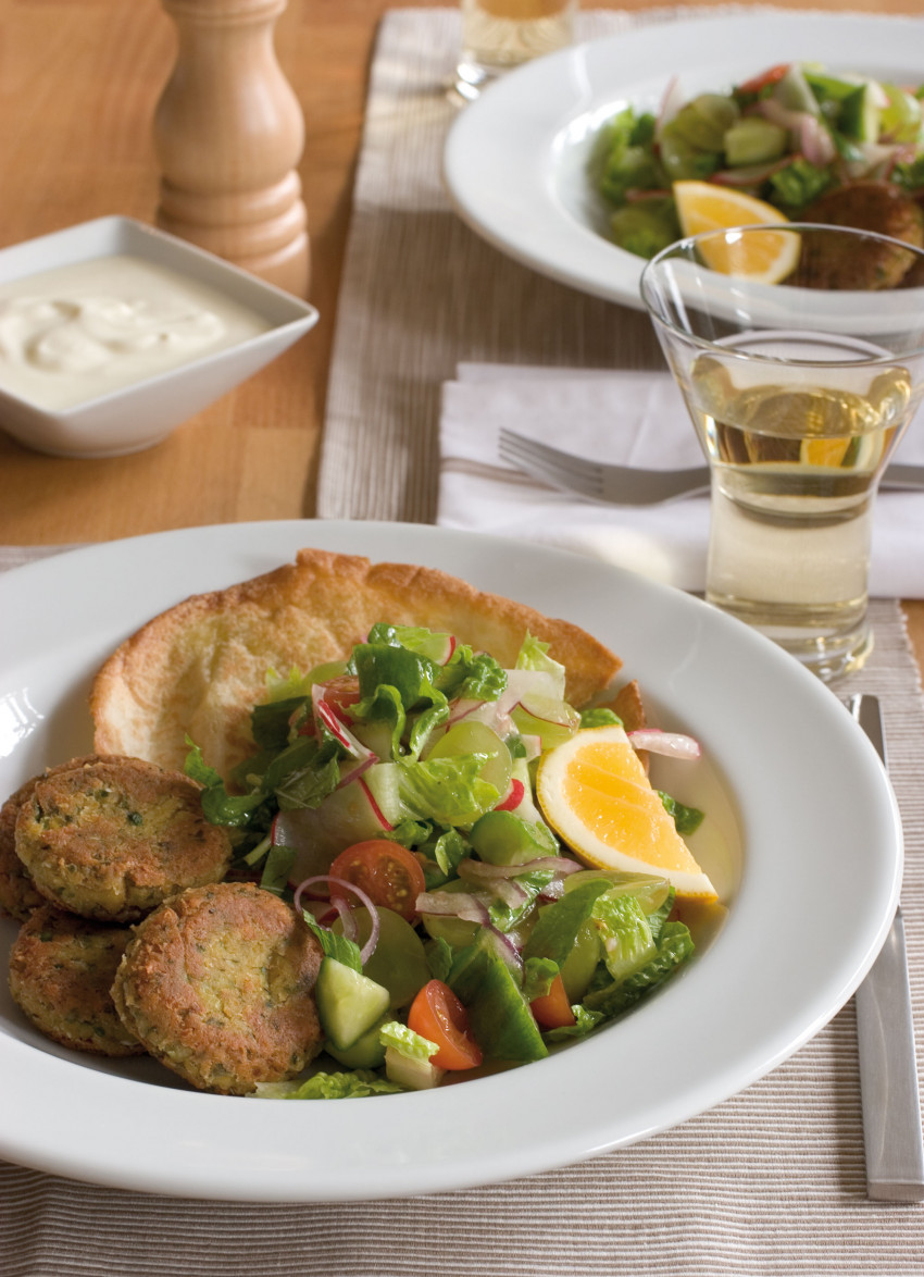 Enjoy a fresh green salad with crisp pita bread and homemade falafel.