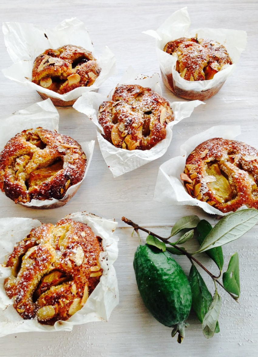 This easy, moist cake batter works with just about any fruit if feijoas aren’t available. Use stone fruit, cherries, persimmons or frozen berries.