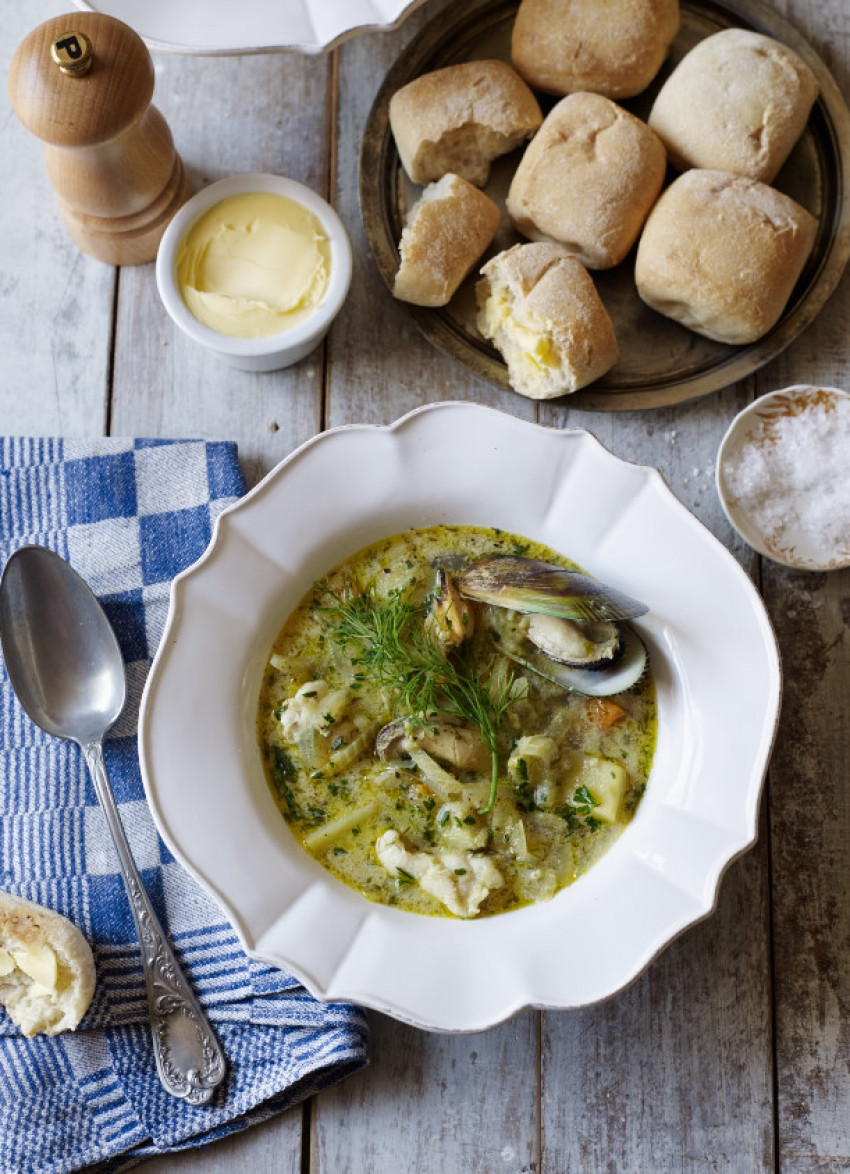 The flavours of the Mediterranean mingle in a broth touched with a hint of liquorice from the fennel and ouzo and packed with lovely chunks of white fish and tender mussels.
