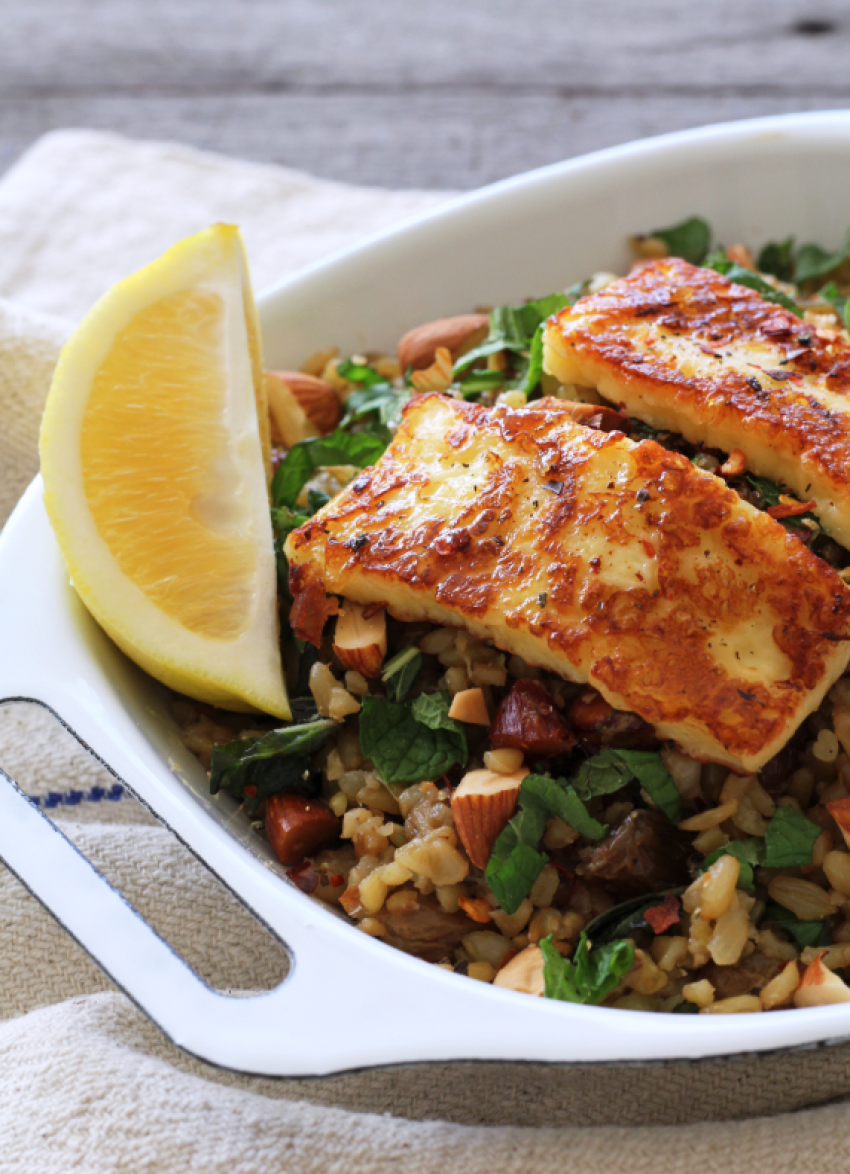 Heat a small amount of oil in another sauté pan over a medium–high heat. Slice haloumi as desired and fry for 1–2 minutes on each side until golden. Place on top of the pilaf and serve immediately. Garnish with additional chopped almonds and fresh mint. Leftovers will keep in an airtight container in the fridge for two days.