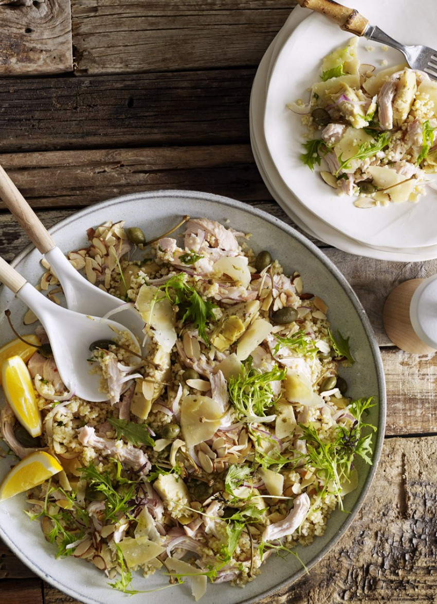 To assemble:Combine the freekeh and dressing in a large bowl then add the chicken, artichokes, onion, basil and half of the almonds. Turn gently to combine.