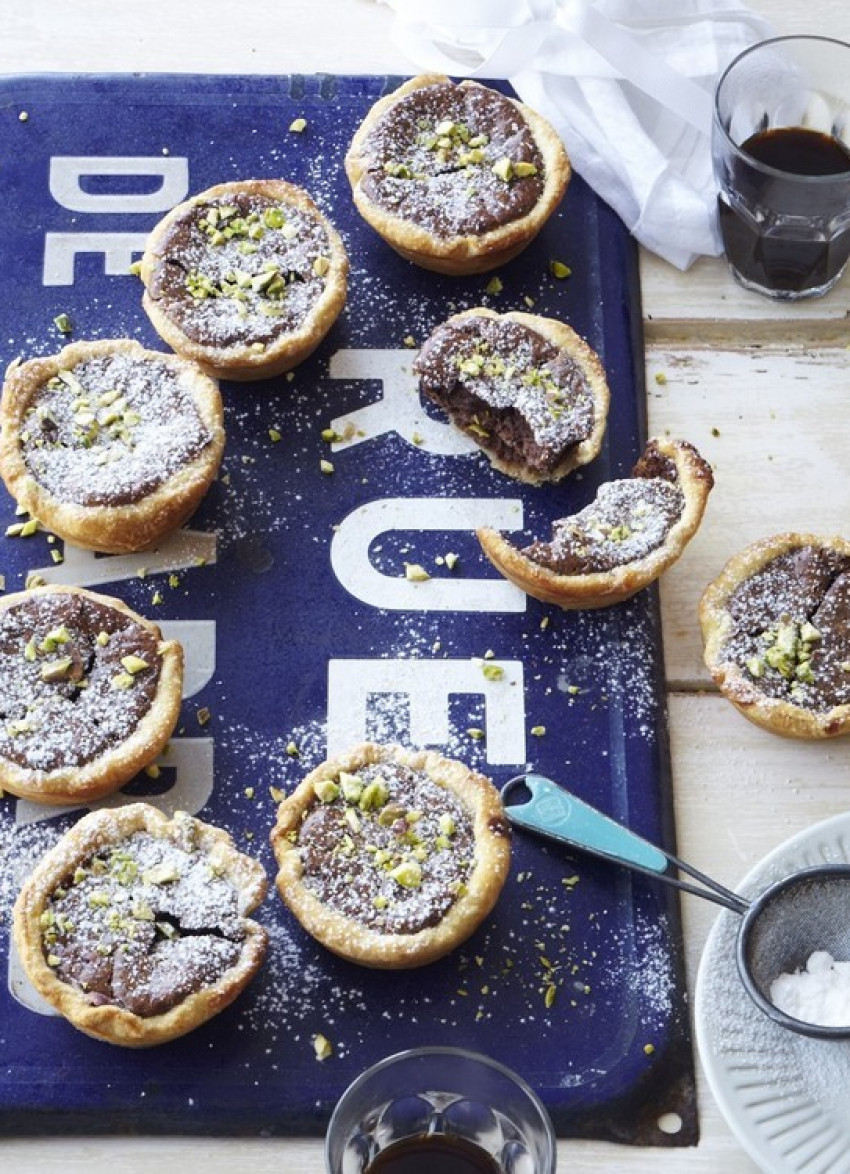 Crispy caramelised pastry shells filled with softly set chocolate custard and topped with pistachios...it's hard to stop at one!