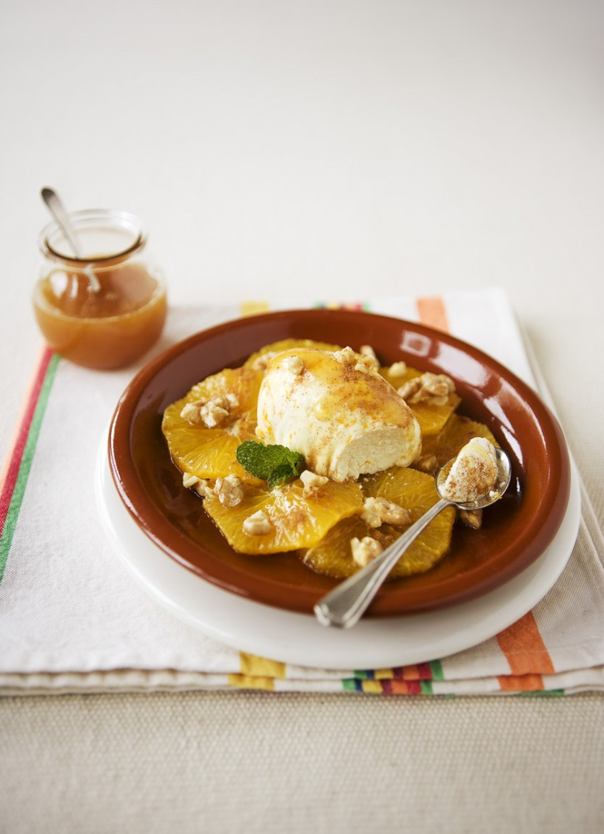 To serve: Untie the muslin and gently turn the cheese out onto a plate. Cut into portions. Arrange the orange slices on serving plates and top with the cheese. Sprinkle with a little cinnamon and drizzle generously with honey. Scatter over the walnuts.