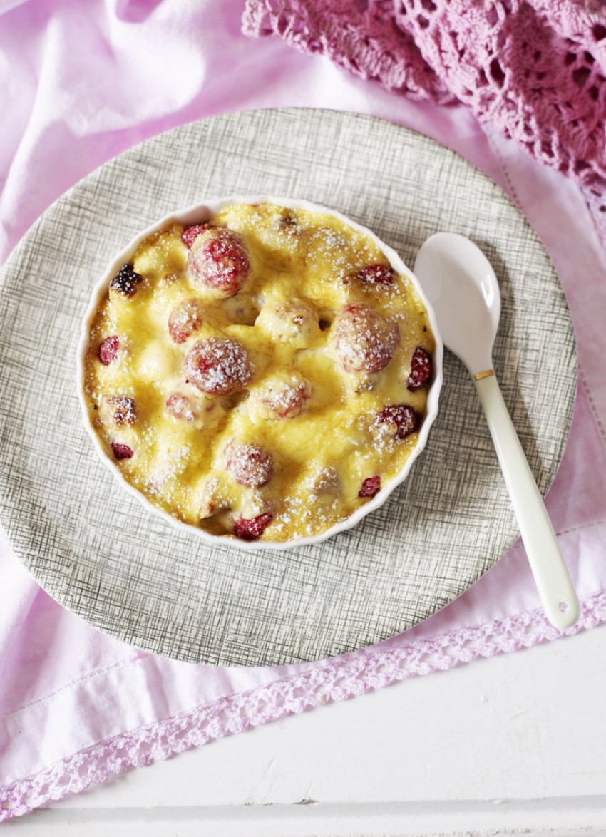 Divide the raspberries between the baking dishes and place on a flat baking tray.