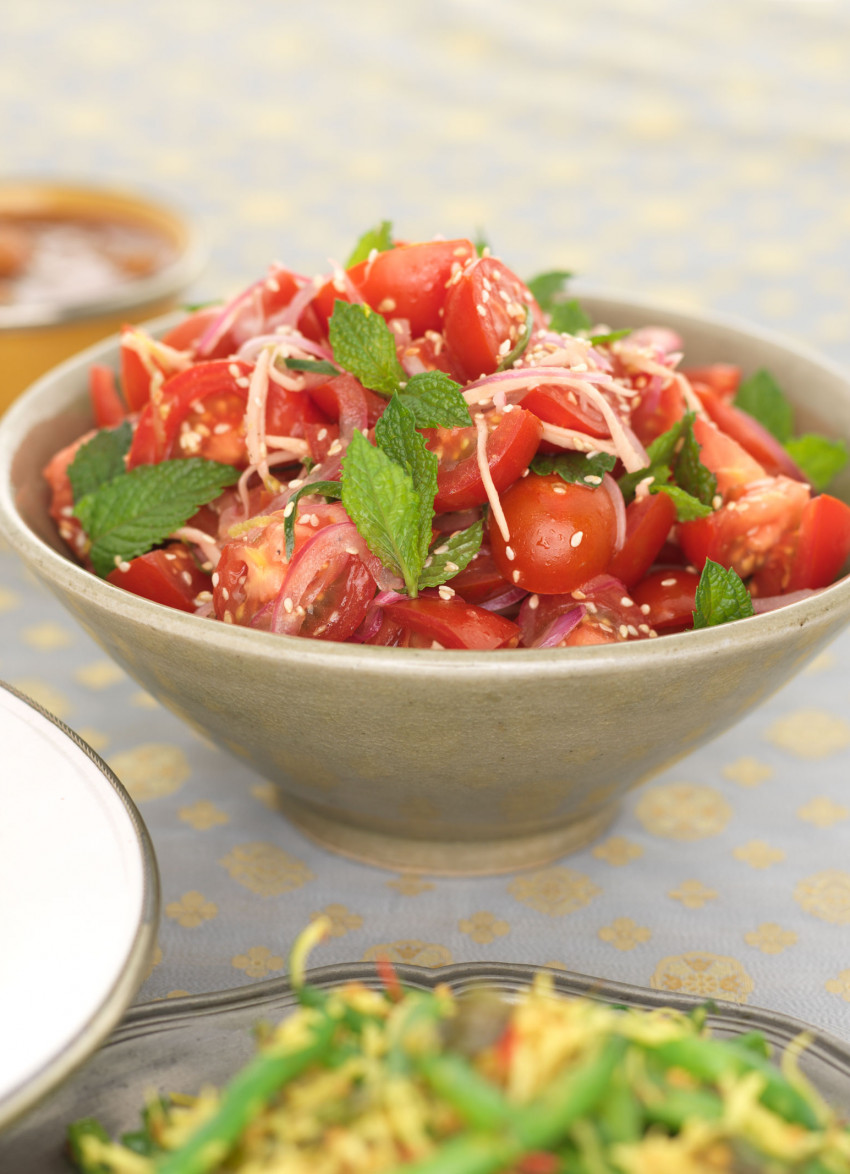 Roughly chop the tomatoes and tear up the mint. Combine with the onion mixture and the sesame seeds and tip into a serving bowl. Drizzle with a little olive oil and freshly ground pepper.