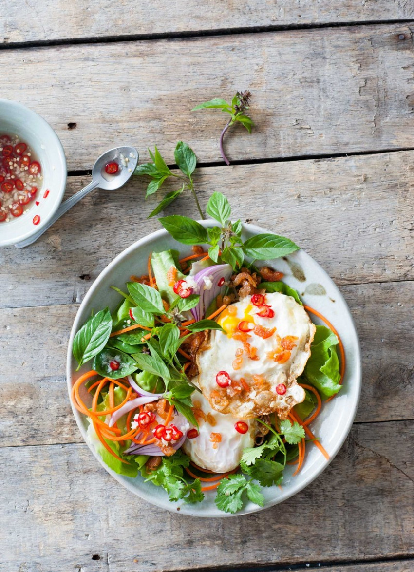 Divide the eggs between four bowls. Add the dressing, fried dried shrimp, lettuce, onion, carrot, herbs and chillies and toss to combine well. Serve immediately.