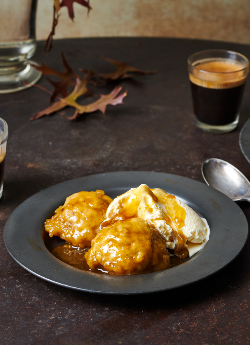 Gorgeous pillowy banana dumplings are cooked in a rich, caramel sauce infused with cinnamon and lemon for a much-loved family dessert.
