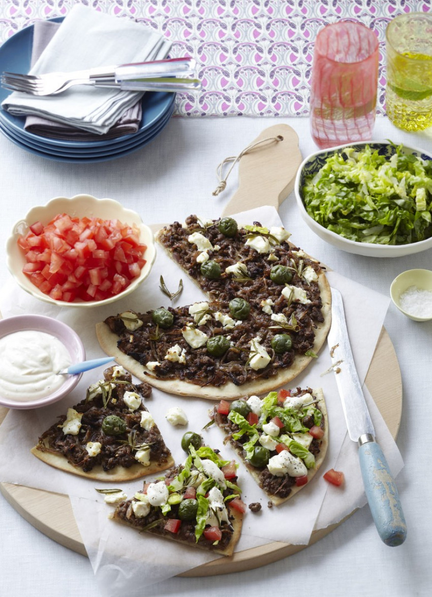 To cook: Place the pizza bases on a flat baking tray and spread with the mince mixture. Top with the olives and feta and sprinkle with a few rosemary leaves. Bake for 10-12 minutes until the bases are crisp and the feta lightly golden.