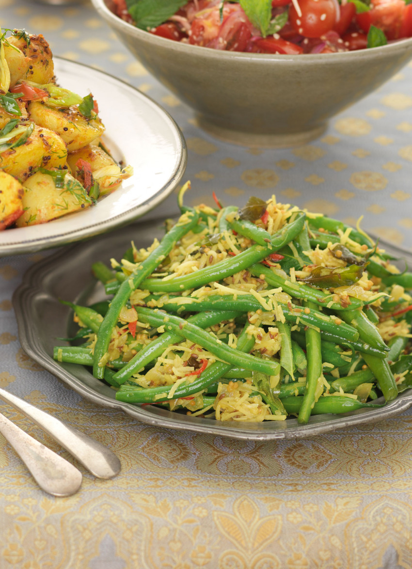 Heat the oil in a sauté pan over a medium heat. Add the onion, garlic and turmeric and fry until soft. Add the cumin, mustard seeds, curry leaves, chilli, coconut and the salt. Stir and cook for a couple of minutes. Add the beans and water and turn to coat in the coconut mixture. Bring to the boil then simmer until the beans are tender and the water has evaporated, stirring occasionally. Season.