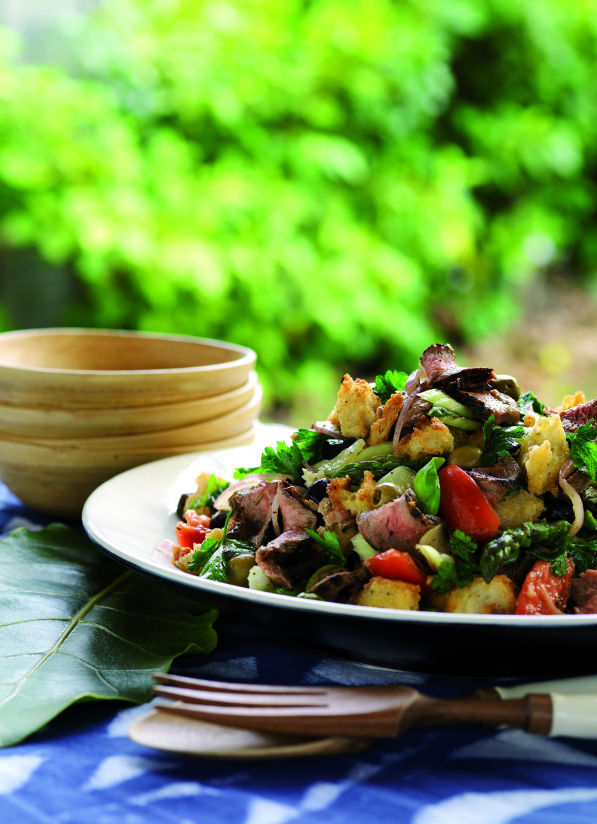 To serve: Toss the beef with half the dressing and the salad with the other half. Combine both then pile onto a serving platter.