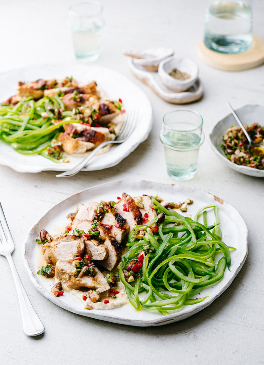 To serve: Divide the hummus between serving plates. Slice the chicken and place over the hummus along with any resting juices. Spoon the almond dressing over the top. We served ours with cooked and shredded green beans.