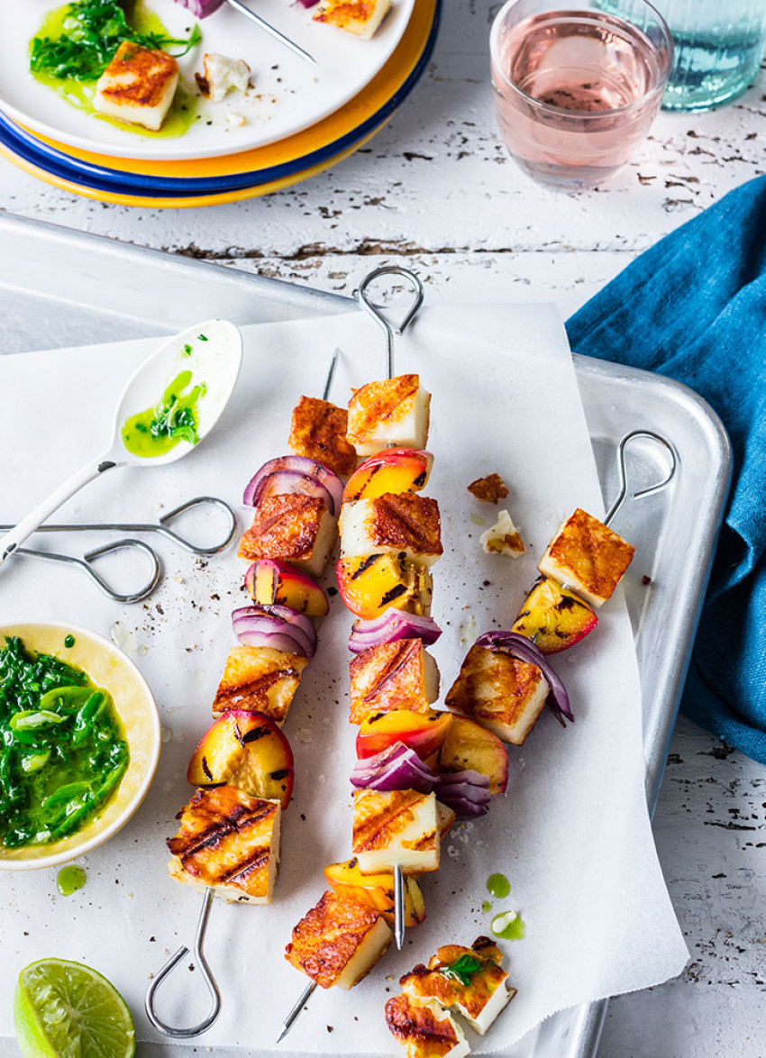 Thread the halloumi, nectarine pieces and red onion wedges on to 8-10 metal skewers. Place on an oven tray and brush with olive oil. Season with salt and pepper. Grill skewers for