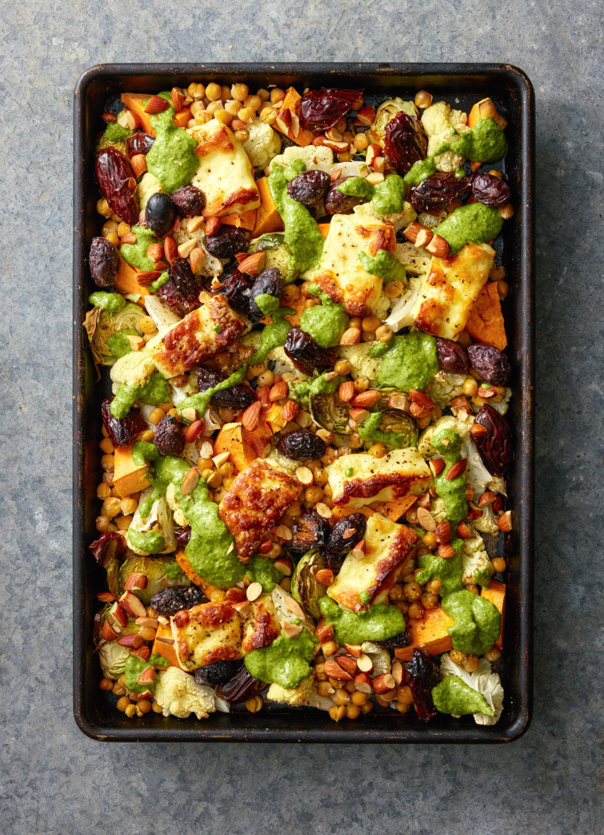 Haloumi and Vege Tray Bake with Green Dressing