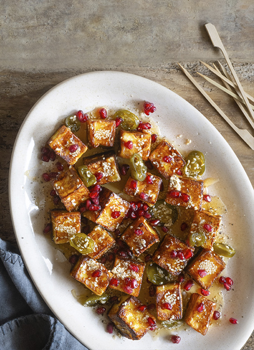 TO SERVE: Place the haloumi on a serving plate, drizzle over the jalapeño and sesame honey and scatter over the pomegranate arils.