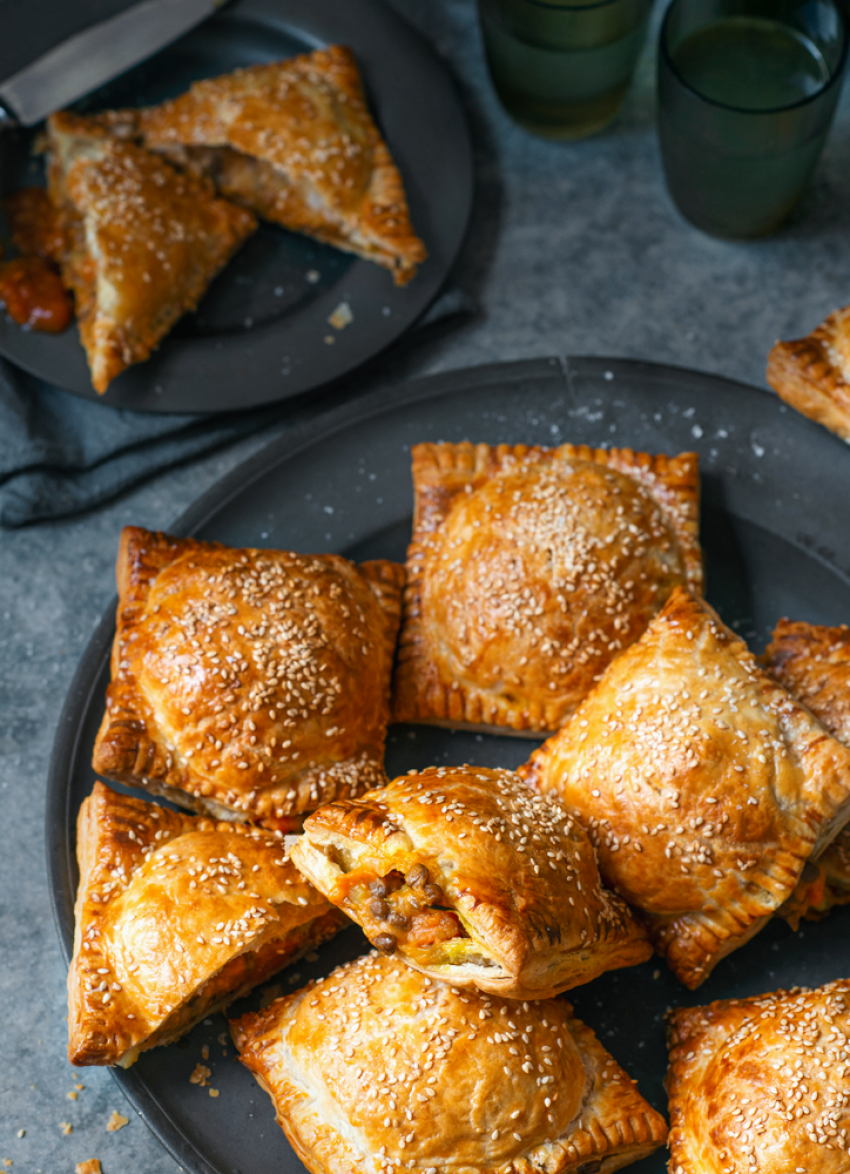 Cut each pastry sheet into 4 squares. Divide the filling between half of the squares and top with the remaining pastry squares. Seal the edges by pressing with the tines of a fork. Compress the pastry around the filling as you go then trim the edges neatly with a sharp knife. Slice 2 small slashes on the top of each pie, brush with egg and sprinkle with sesame seeds. Refrigerate while the oven preheats to 180°C.