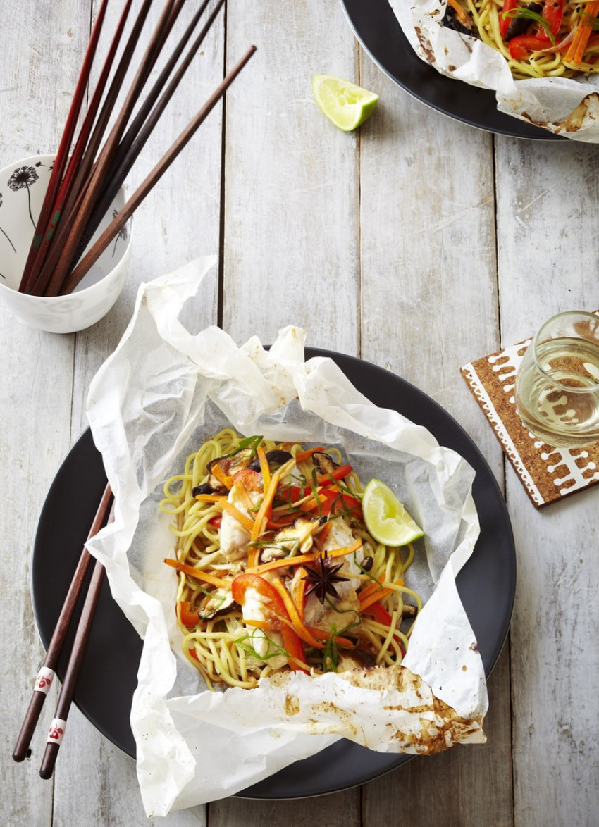 Divide the fish between the parcels and place on top, season then scatter over the remaining vegetables and place a star anise on top. Spoon most of the glaze over the fish and the rest over the noodles. Fold in the baking paper to make a flattish parcel then fold in the foil, pinching the edges together to seal.